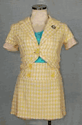 | |  |  | | | | Cropped short sleeved jacket with custom sleeves and coordinating mini skirt made by Wet Seal. Oversized yellow and white hounds tooth pattern in woven cotton. Customized button cuffed sleeves in a lightweight blush colored fabric, peek out from beneath the jacket sleeve. The jacket closes at the waist with a single, large button. The lapel is adorned with a pinned-on rhinestone brooch. The top band of the straight miniskirt is given a tailored look with the addition of four large yellow buttons. No tags with sizes are present, but the jacket measures 13 ½” from armpit to armpit, 12 ¾” across the shoulders in the back, and is 13 ¾” long to the waist. The skirt, laid flat, measures 14” at waist and 14” long. From the set of Hannah Montana. | | Item Code: 031-iaw | | Price: $270.00 |